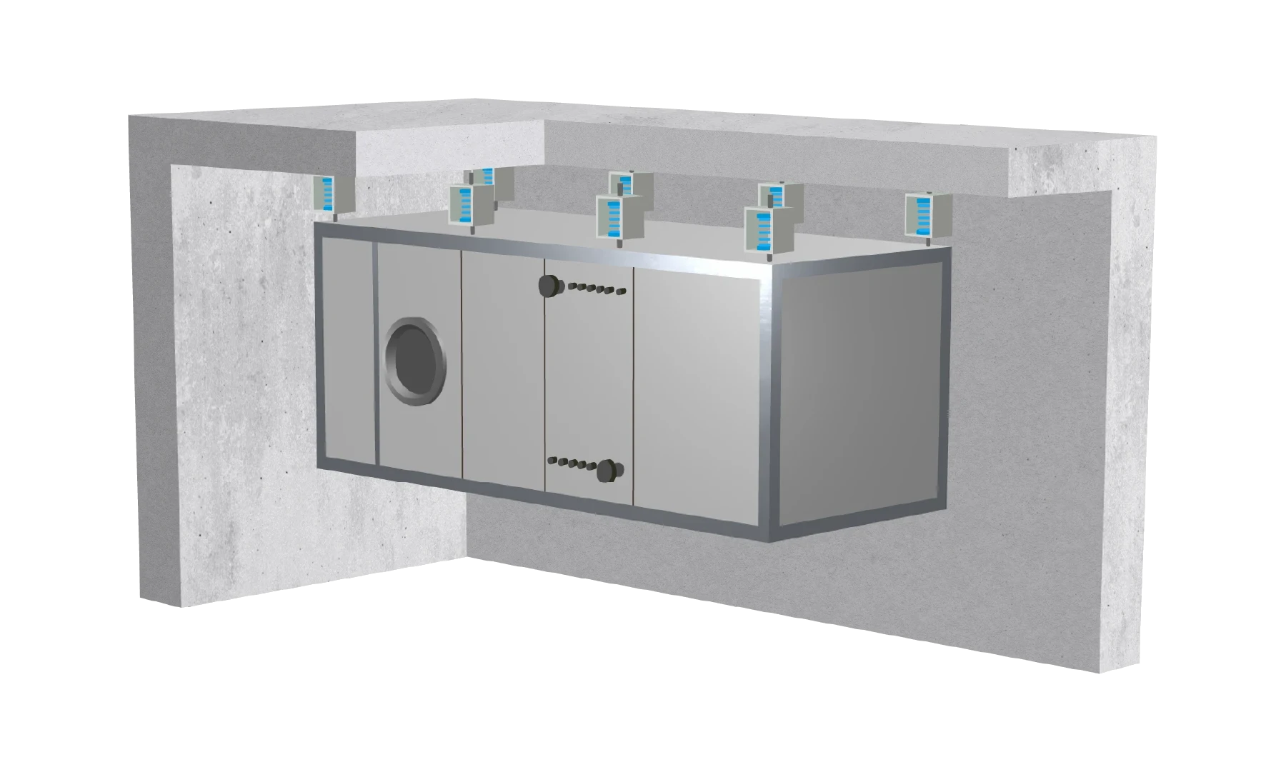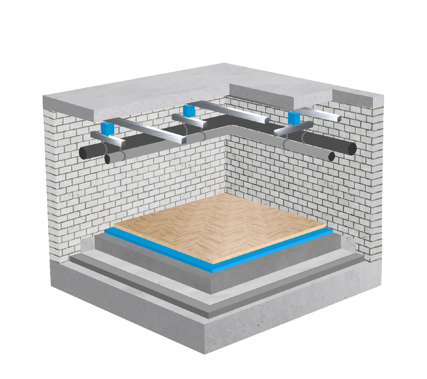 We designed a full suite of technical illustrations tailored to HBT-ISOL’s product ecosystem. These images showcase not only the products themselves—such as suspension systems, ducts, and machine insulation—but also how they are used in situ within concrete structures or mechanical rooms. Our visual strategy was centred around creating a consistent and elevated style that would work equally well across screen and print.